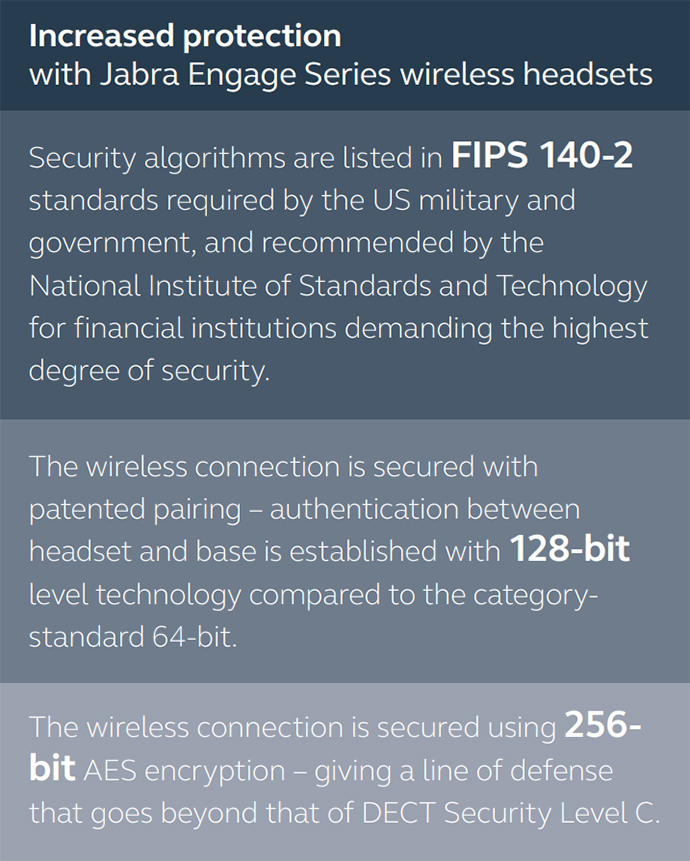 Jabra Engage Series wireless headsets go one step further, taking advantage of encryption algorithms listed in FIPS 140-2 standards required by the US military and government. This level of security goes beyond DECT Level C.